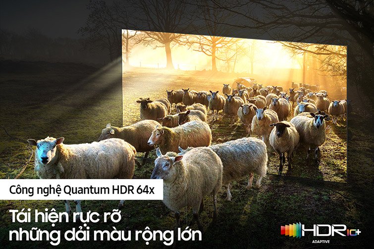 Quantum HDR 64x. Công nghệ lượng tử HDR 64X định ra chuẩn mực về khả năng hiển thị chi tiết và độ sáng. Tận hưởng hình ảnh với màu sắc rực rỡ, chính xác và tương phản cao với chi tiết sắc nét. Công nghệ HDR10+ tuỳ chỉnh màu sắc và độ tương phản trong từng cảnh quay. Hoàn hảo đến từng sắc thái.